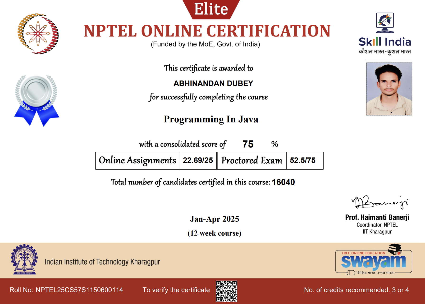 An "Elite + Silver" certification from the National Programme on Technology Enhanced Learning (NPTEL). This course solidified my foundational knowledge and skills in Java programming.