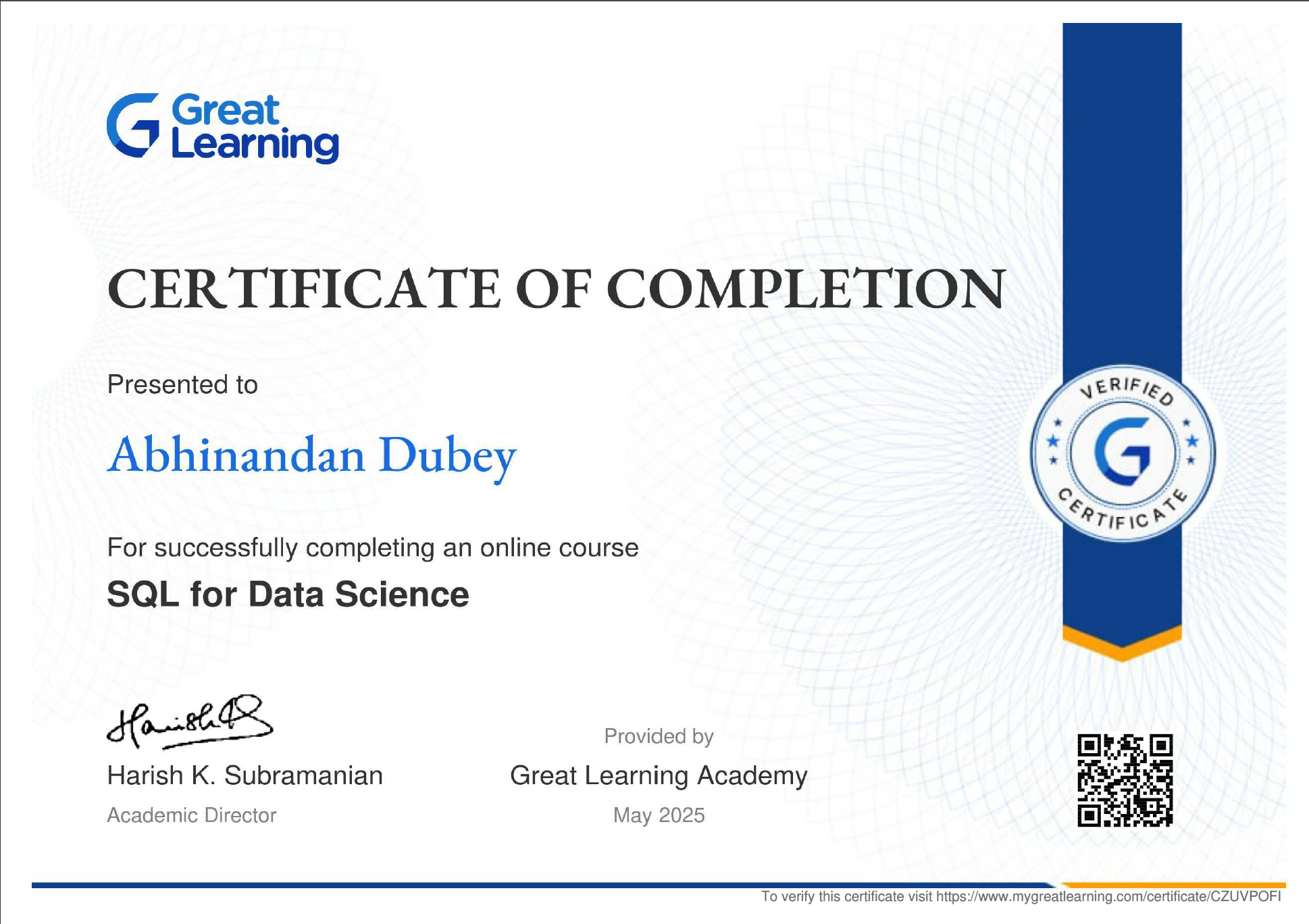 This certification validates my ability to efficiently query, manipulate, and manage databases to extract valuable insights for data-driven projects.